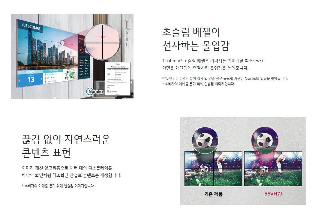 비디오월의 경우, 패널이 여러개 배치되다 보니 패널과 패널 사이에 간격 (베젤과 베젤 사이) 이 존재한다는 단점이 있으나, 최근 출시되고 있는 비디오월 패널의 경우 패널과 패널 사이의 간격이 요즘 줄어들고 있어 화면을 매끄럽게 연결시켜 몰입감을 높여줄 수 있다.